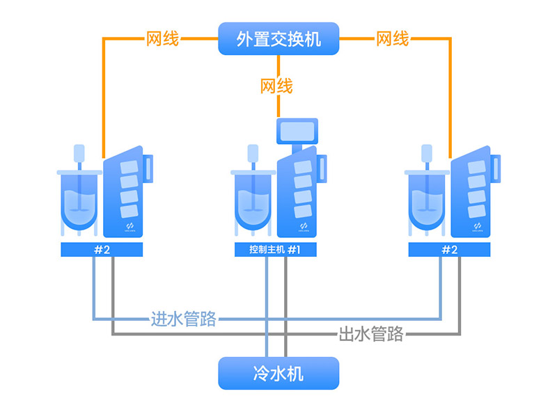 Cla多联系统是类似搭积木的方式,将功能模板与机箱、罐体进行联合。每个罐体的参数监测电极线与机箱连接,另外置交换机通过网线将每个机箱连接,进行数据传输、控制,由其中一台机箱配置14寸HMI进行总控。