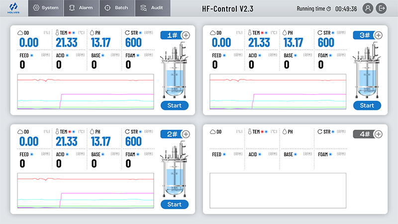 多联罐的主控界面如下图所示,所有罐体的主要参数数据都会在总界面显示,方便监控。